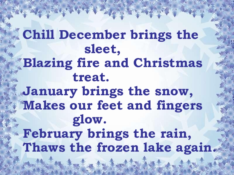 Chill December brings the 							sleet, Blazing fire and Christmas 						treat. January brings the snow, Makes
