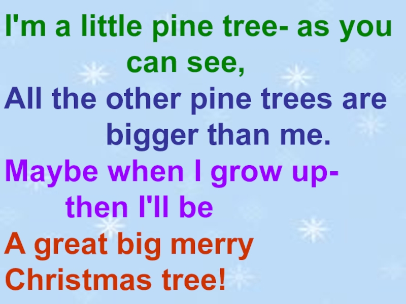 I'm a little pine tree- as you can see, All the other pine trees are bigger than me. Maybe when I grow up- then I'll be A great big merry Christmas tree!