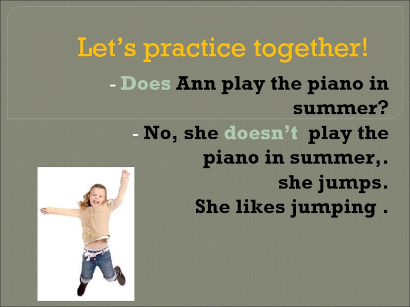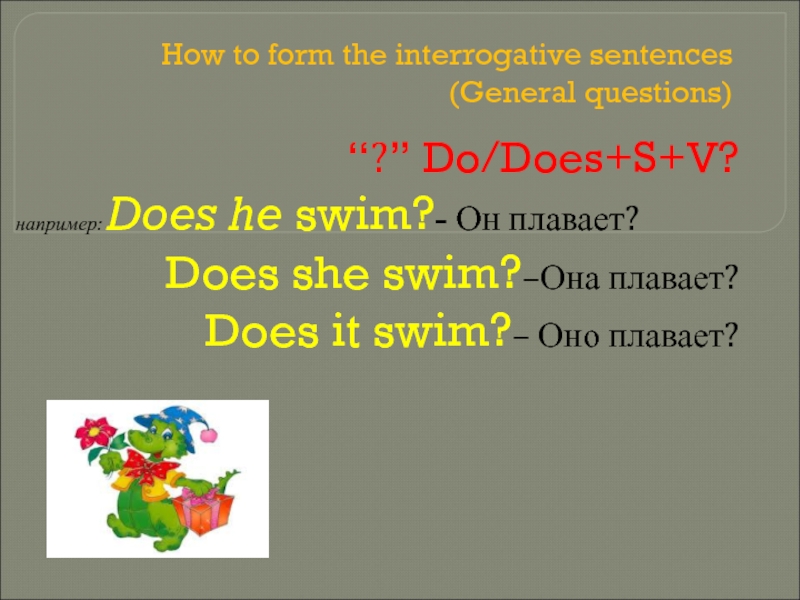 How to form the interrogative sentences (General questions)“?” Do/Does+S+V?например: Does he swim?- Он плавает?
