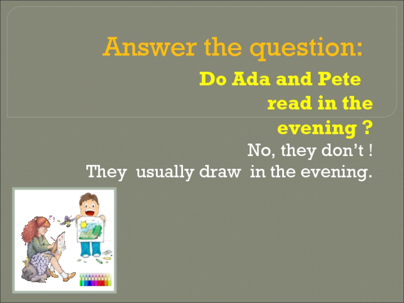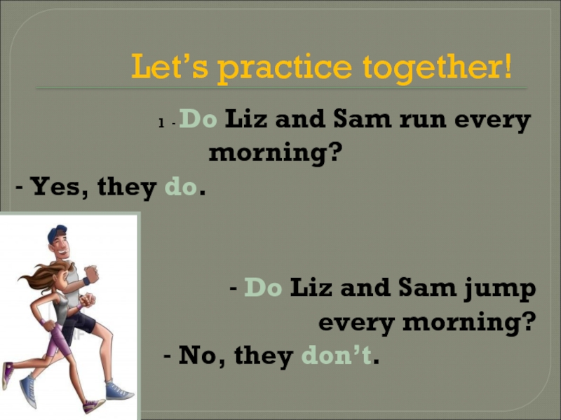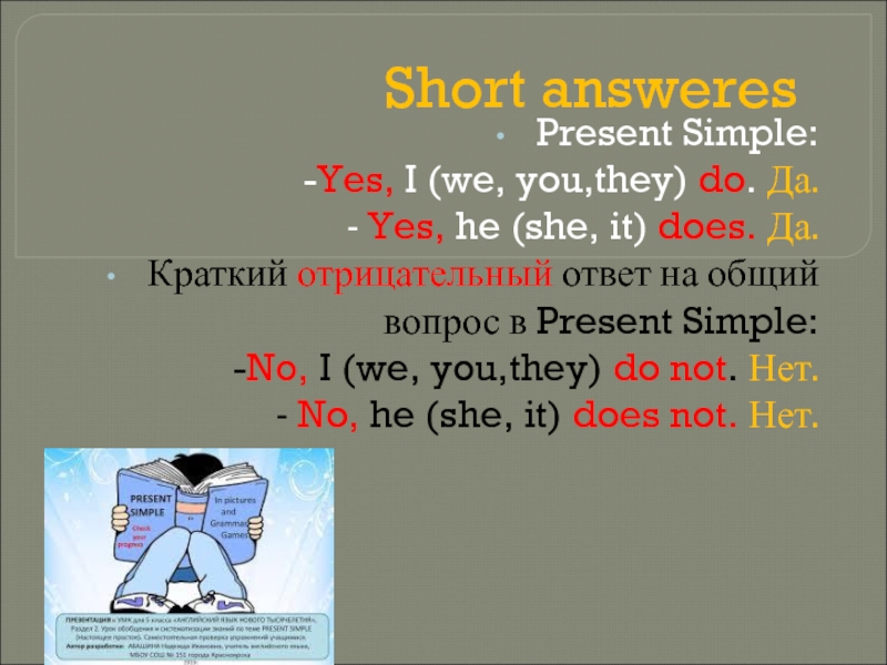Short answeresPresent Simple:   -Yes, I (we, you,they) do. Да.   - Yes, he (she,