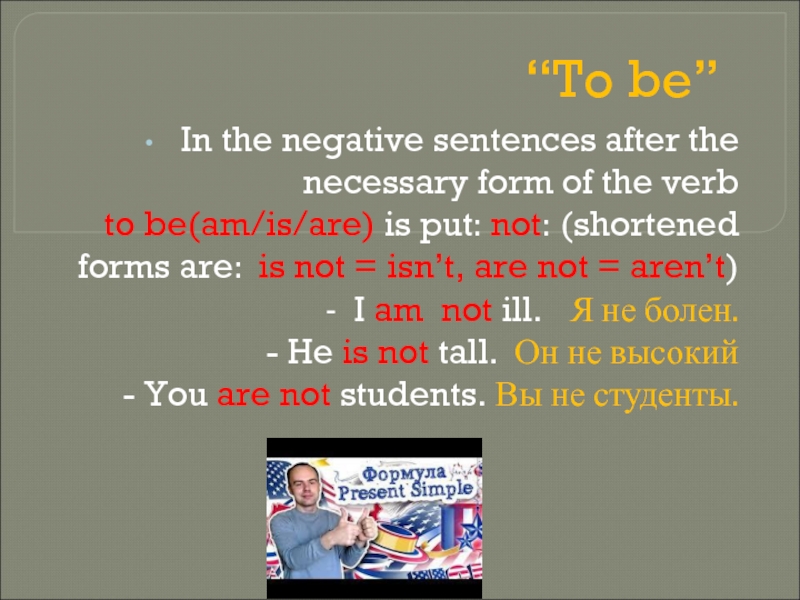 “To be”In the negative sentences after the necessary form of the verb to be(am/is/are) is put: not: