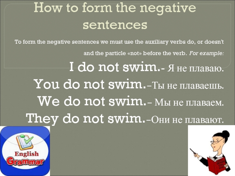 How to form the negative sentencesTo form the negative sentences we must use the auxiliary verbs do, or doesn't and the particle «not» before the verb. For example: I do not swim.- Я не плаваю.