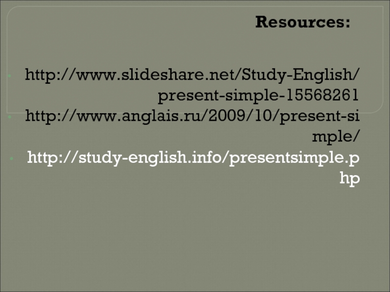 Resources: http://www.slideshare.net/Study-English/present-simple-15568261http://www.anglais.ru/2009/10/present-simple/http://study-english.info/presentsimple.php