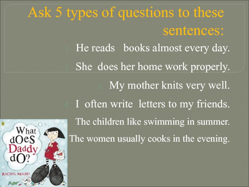 Ask 5 types of questions to these sentences: Не reads   books almost every day.She  does her