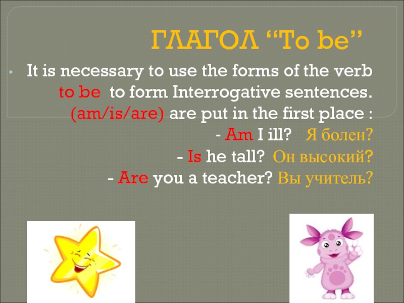 ГЛАГОЛ “To be”It is necessary to use the forms of the verb to be to form Interrogative