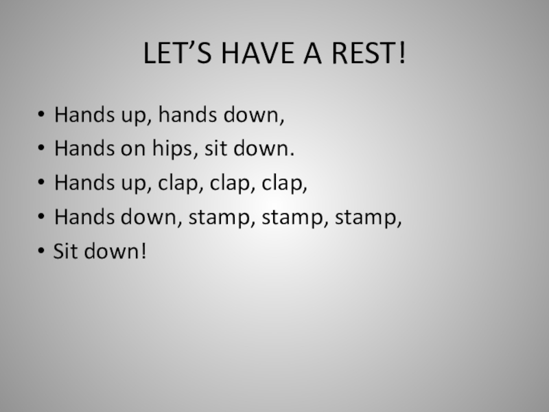 LET’S HAVE A REST!Hands up, hands down,Hands on hips, sit down.Hands up, clap, clap, clap, Hands down,