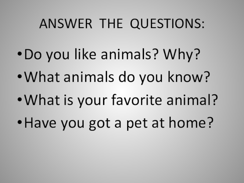 ANSWER THE QUESTIONS:Do you like animals? Why?What animals do you know?What is your favorite animal?Have you got a pet at home?
