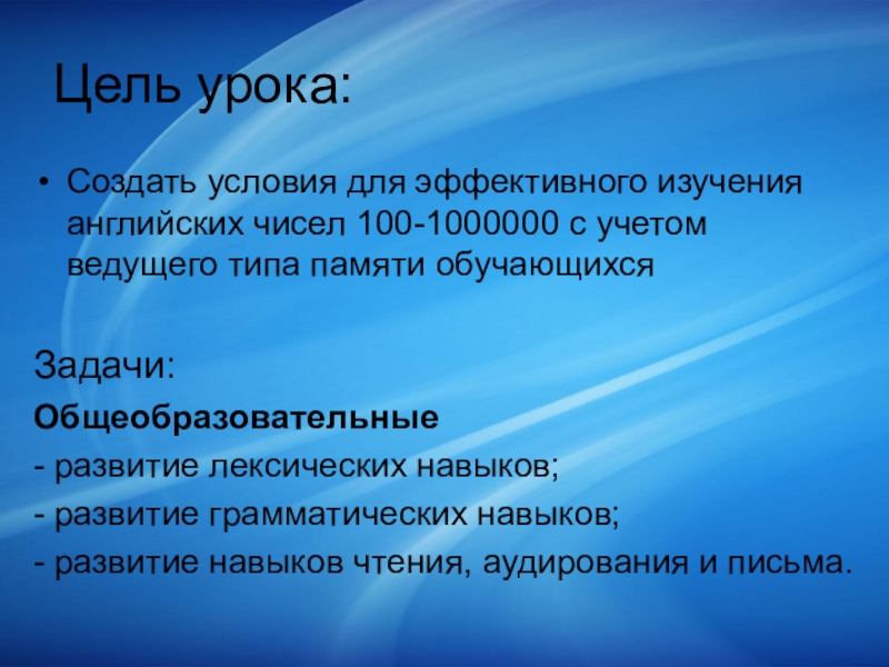 Создать условия для эффективного изучения английских чисел 100-1000000 с учетом