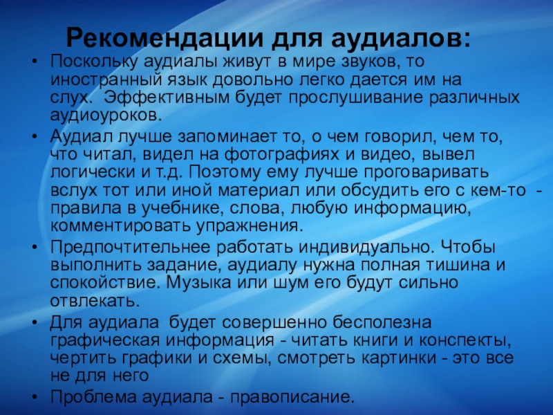 Слайд 9Рекомендации для аудиалов: