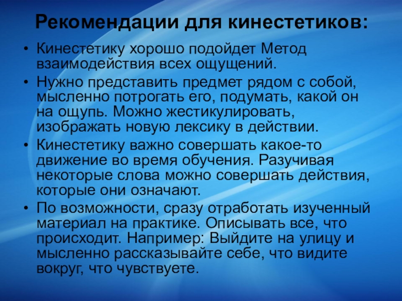 Слайд 10Рекомендации для кинестетиков: