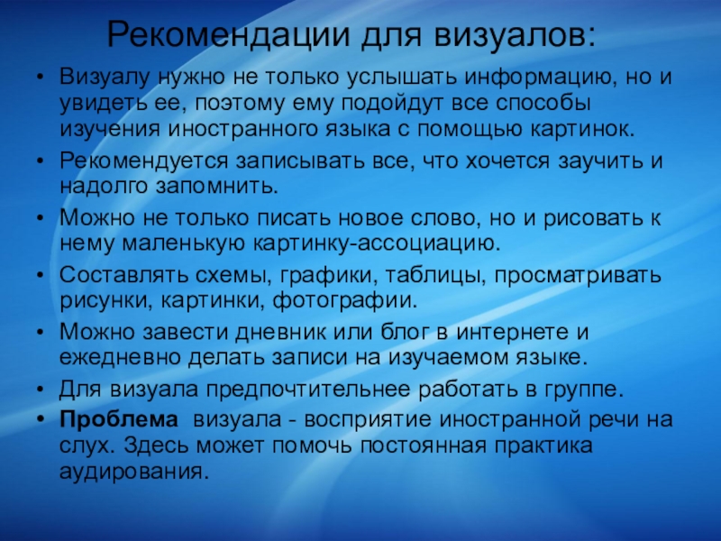 Проблема визуала - восприятие иностранной речи на слух. Здесь может помочь постоянная практика аудирования.