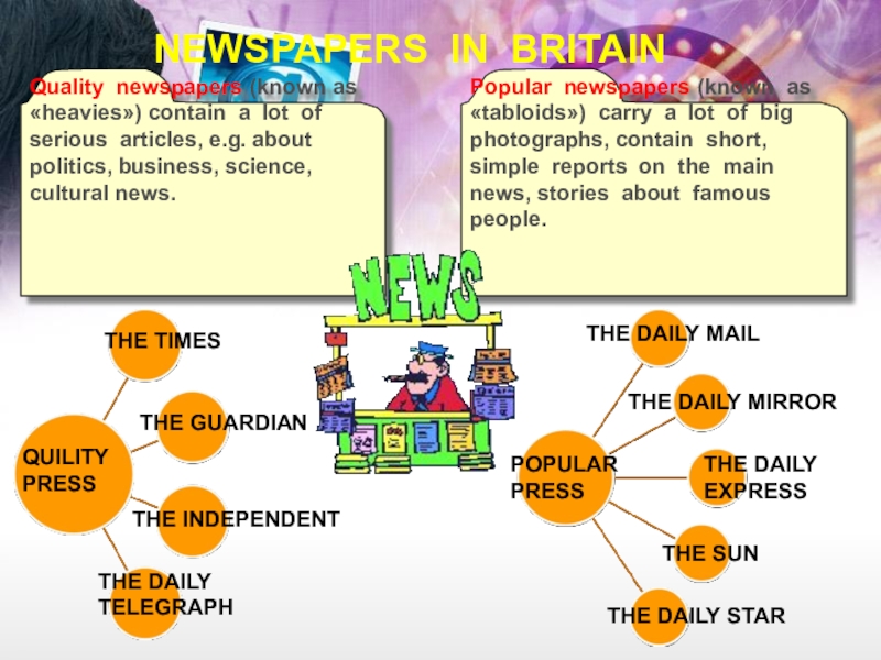 Quality newspapers (known as «heavies») contain a lot of serious articles, e.g. about politics, business, science, cultural news.
