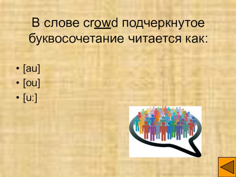 Слайд 11В слове crowd подчеркнутое буквосочетание читается как:
