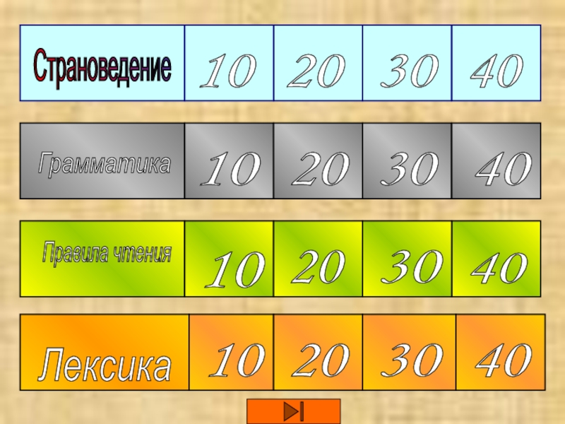 Правила чтения Страноведение Грамматика Лексика 10 20 30 40 10 10 10 20 20 20 30 30 30 40 40 40