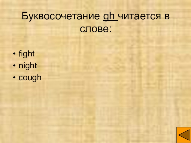 Слайд 13Буквосочетание gh читается в слове:
