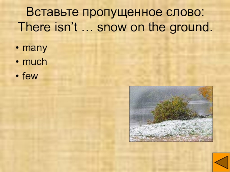Слайд 4Вставьте пропущенное слово: There isn’t … snow on the ground.