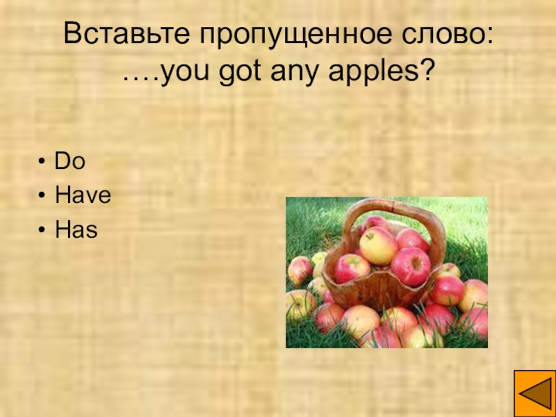 Слайд 3Вставьте пропущенное слово: ….you got any apples?