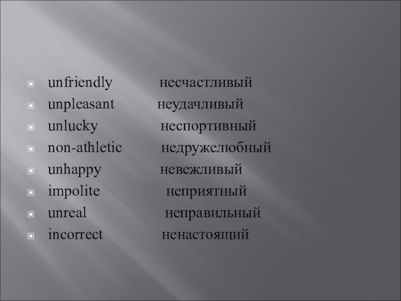 unfriendly      несчастливыйunpleasant      неудачливыйunlucky