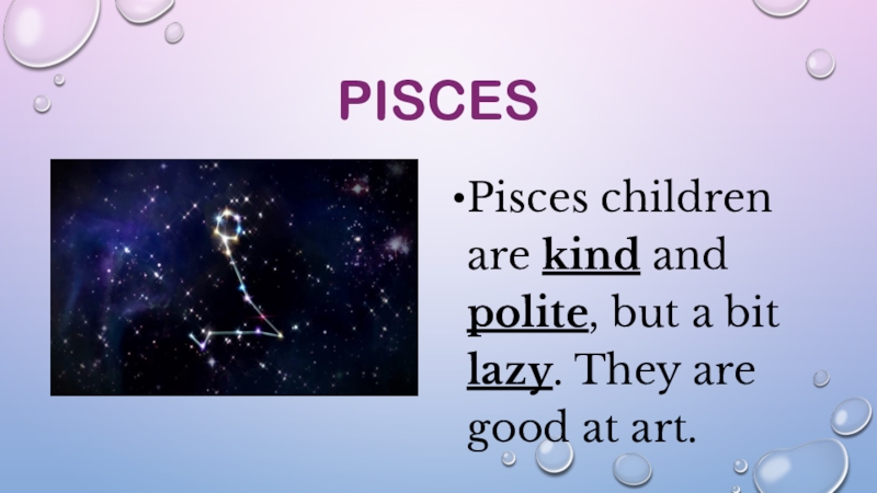 pISCESPisces children are kind and polite, but a bit lazy. They are good at art.