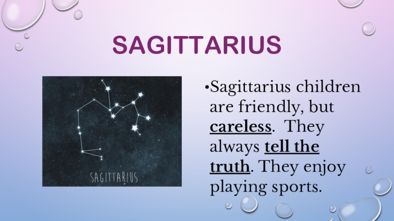 sagittariusSagittarius children are friendly, but careless. They always tell the truth. They enjoy playing sports.