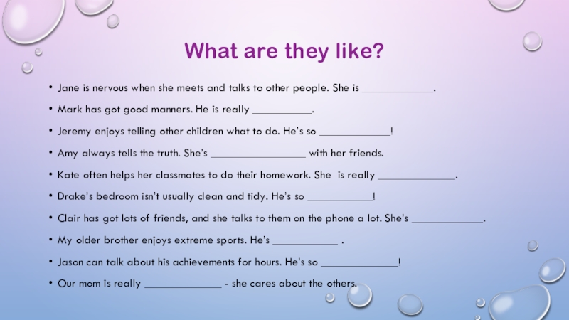 What are they like?Jane is nervous when she meets and talks to other people. She is ____________.Mark