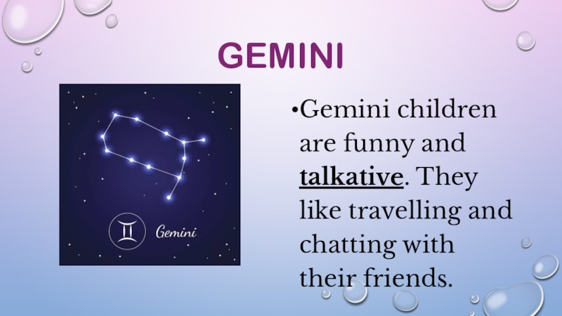 geminiGemini children are funny and talkative. They like travelling and chatting with their friends.