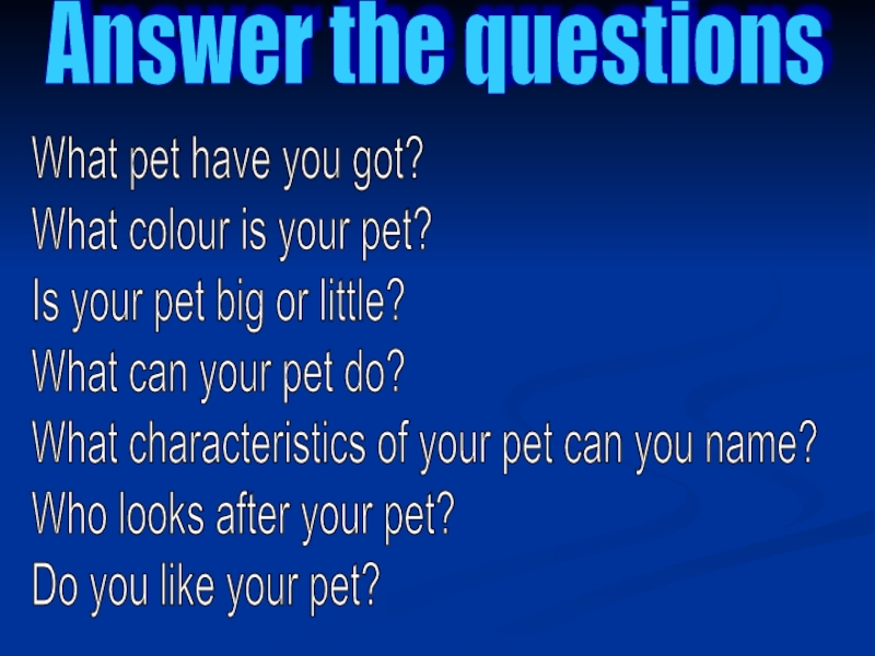 Answer the questionsWhat pet have you got?  What colour is your pet?  Is your pet