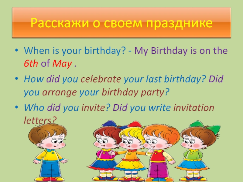 Расскажи о своем праздникеWhen is your birthday? - My Birthday is on the 6th of May .How
