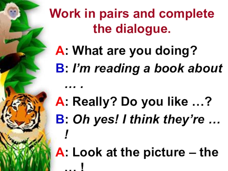 Work in pairs and complete  the dialogue.A: What are you doing?B: I’m reading a book about