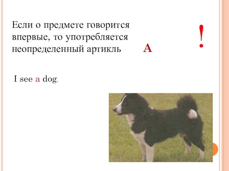 Если о предмете говорится впервые, то употребляется неопределенный артикль!I see a dog.A