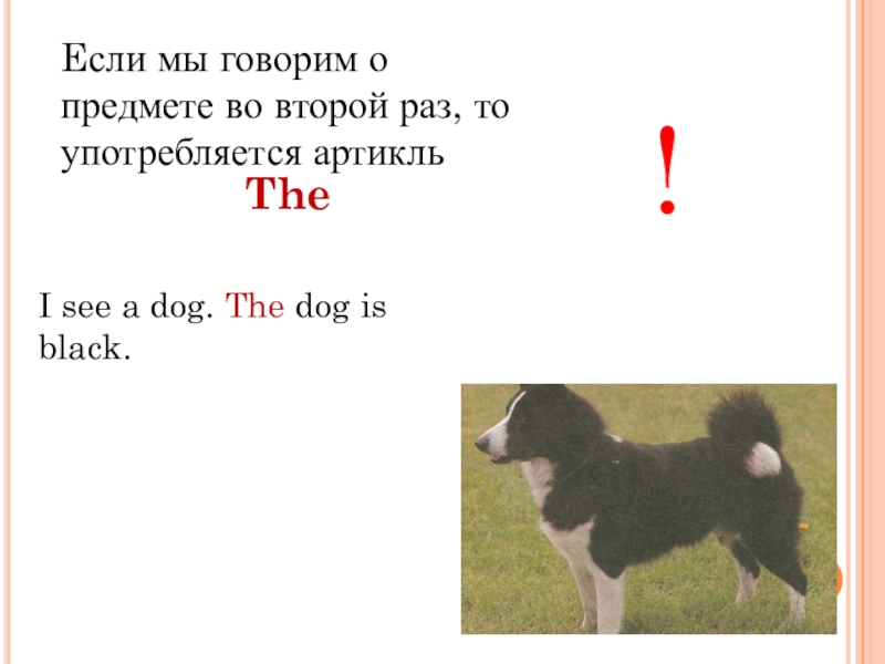 Eсли мы говорим о предмете во второй раз, то употребляется артикль!I see a dog. The dog is