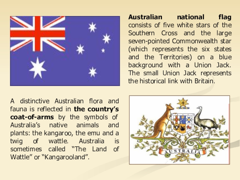 Australian national flag consists of five white stars of the Southern Cross and the large seven-pointed Commonwealth star (which represents the six states and the Territories) on a blue background with a Union Jack. The small Union Jack represents the historical link with Britain.