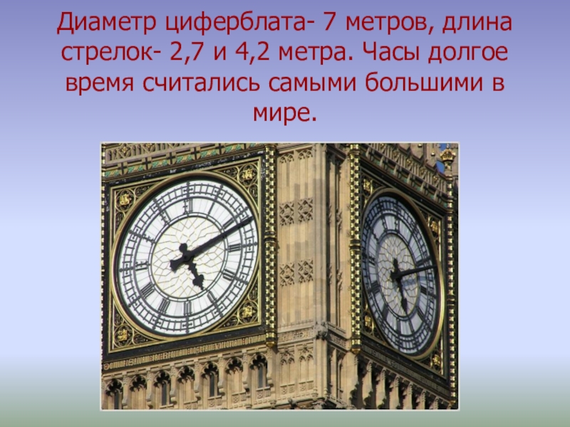 Слайд 8Диаметр циферблата- 7 метров, длина стрелок- 2,7 и 4,2 метра. Часы