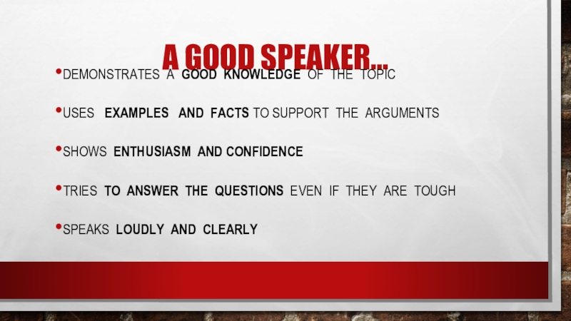 A good speaker…Demonstrates a good knowledge of the topicUses  examples  and facts to support the