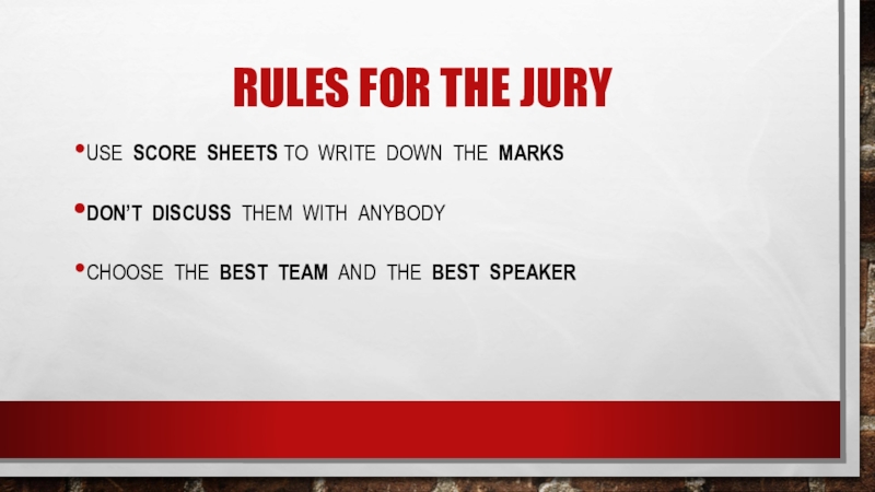 Rules for the juryUse score sheets to write down the marksdon’t discuss them with anybodyChoose the best