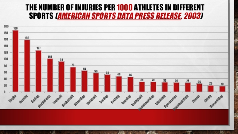 Слайд 13The number of injuries per 1000 athletes in different sports (American