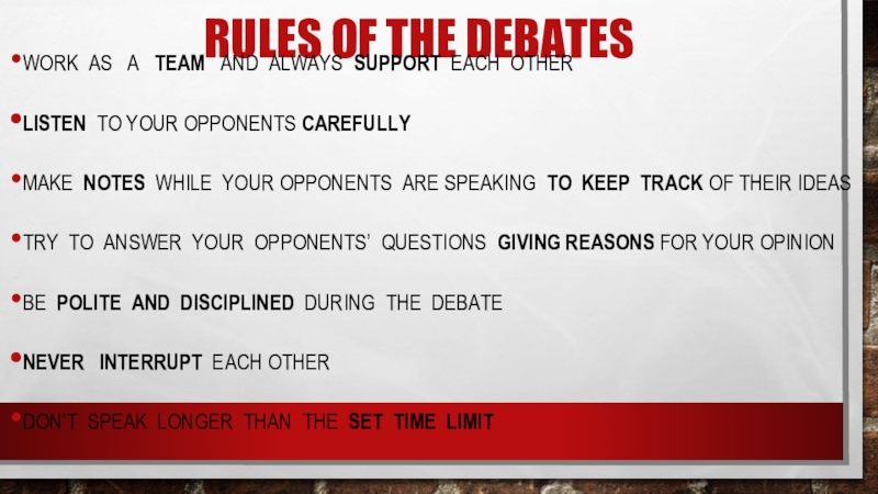 Rules of the debatesWork as  a  team  and always support each otherListen to your
