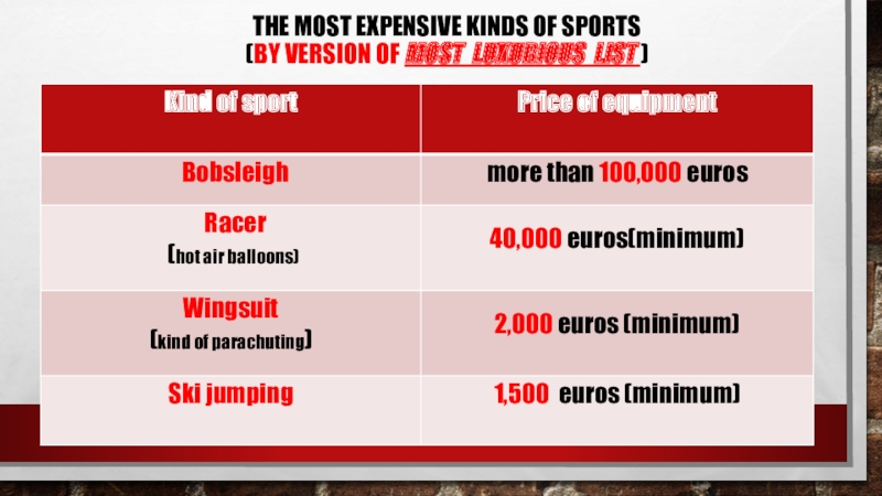 Слайд 15The most expensive kinds of sports (by version of Most luxurious