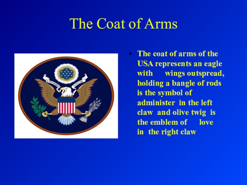 an eagle with wings outspread, holding a bangle of rods is the symbol of administer in the left claw and olive twig is the emblem of love in the right claw