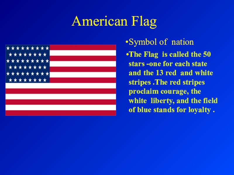 for each state and the 13 red and white stripes .The red stripes proclaim courage, the white liberty, and the field of blue stands for loyalty .