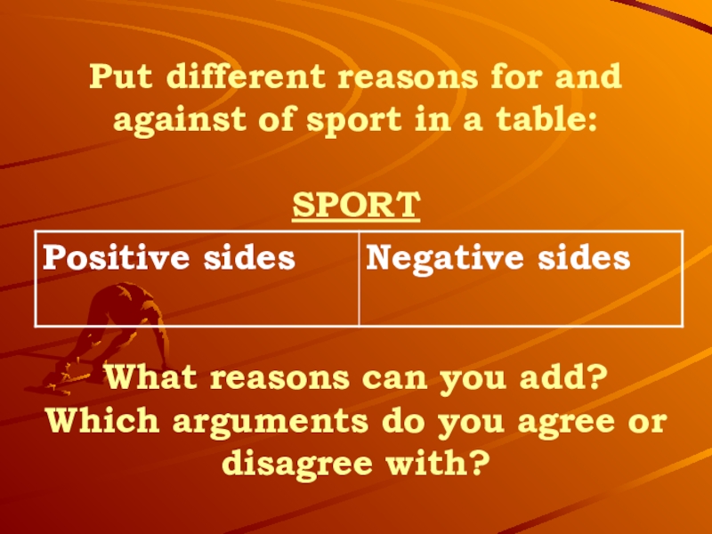 Слайд 21Put different reasons for and against of sport in a table: