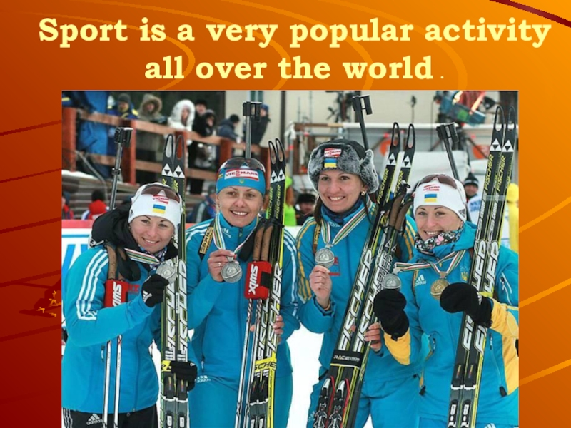 Слайд 2Sport is a very popular activity all over the world .