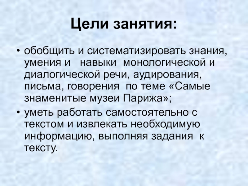 Цели занятия:обобщить и систематизировать знания, умения и навыки монологической и диалогической речи, аудирования, письма, говорения по теме «Самые знаменитые музеи Парижа»; уметь работать самостоятельно с текстом и извлекать необходимую информацию, выполняя задания к тексту.