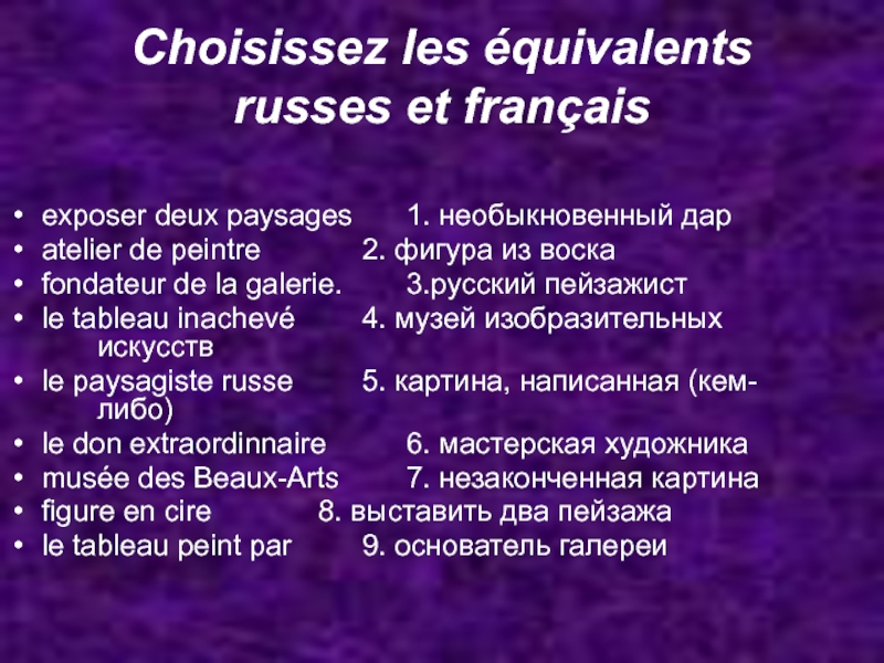 Choisissez les équivalents russes et français exposer deux paysages		1. необыкновенный дарatelier de peintre			2. фигура из воскаfondateur de