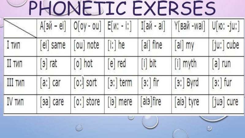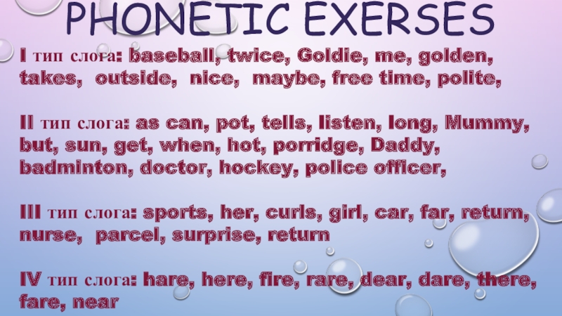IV тип слога: hare, here, fire, rare, dear, dare, there, fare, near