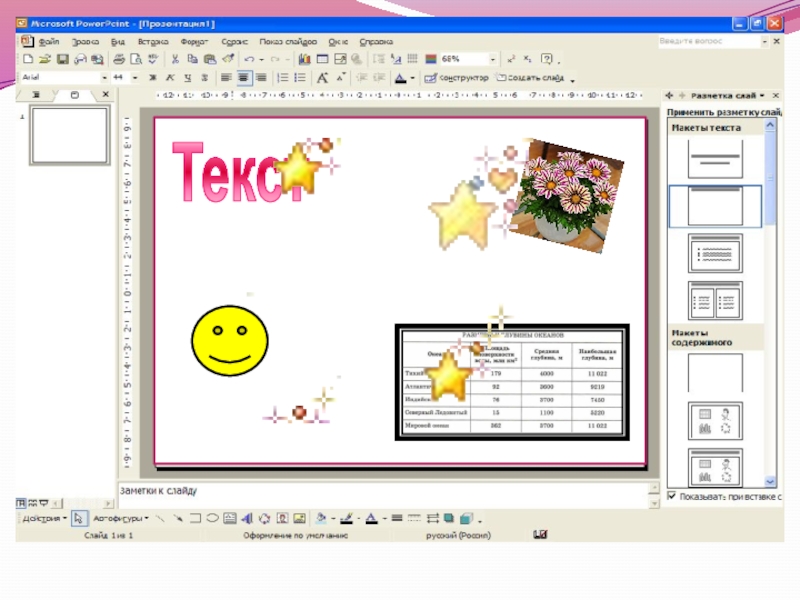 Это сайт презентаций, где можно хранить и обмениваться своими презентациями, докладами, проектами, шаблонами в формате PowerPoint с другими пользователями. Мы помогаем школьникам, студентам, учителям, преподавателям хранить и обмениваться учебными материалами.