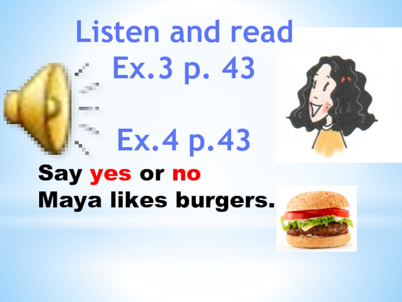 Listen and readEx.3 p. 43 Ex.4 p.43 Say yes or noMaya likes burgers.