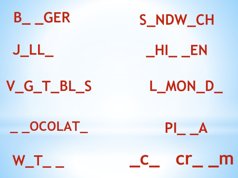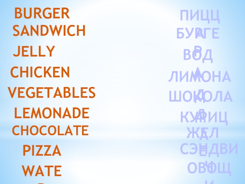 BURGERSANDWICHJELLYCHICKENVEGETABLESLEMONADECHOCOLATEPIZZAWATERЖЕЛЕБУРГЕРОВОЩИСЭНДВИЧВОДАШОКОЛАДЛИМОНАДКУРИЦАПИЦЦА