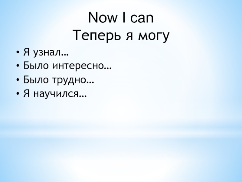 Now I canТеперь я могуЯ узнал…Было интересно…Было трудно…Я научился…