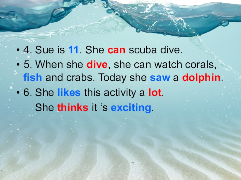 4. Sue is 11. She can scuba dive. 5. When she dive, she can watch corals, fish
